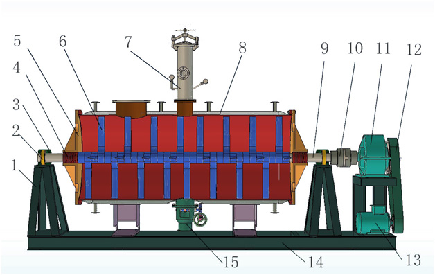 l  主軸有實(shí)心和空心兩種結(jié)構(gòu),可采用空心,與夾套一同加熱,增大了加熱面積,提高了干燥效率。