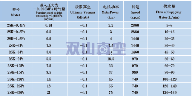 該類真空機組是由2SK系列兩級水環(huán)真空泵在吸入口加裝大氣泵組成,最低吸入壓力可達0.5~1kPa(A),在吸入壓力為1 ~ 6kPa(A) 之間仍有較大抽速,因此適合于在較高真空下工作。