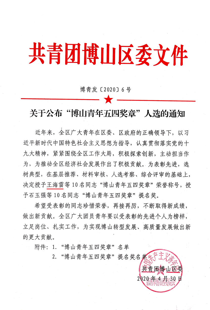 2020年4月30日,共青團(tuán)淄博市博山區(qū)委員會(huì)組織召開了“綻放戰(zhàn)役青春  堅(jiān)定制度自信”主題宣講暨優(yōu)秀青年事跡分享會(huì)。區(qū)委常委、組織部部長楊發(fā)磊,副區(qū)長李林出席會(huì)議。會(huì)上授予我公司員工王海雷等10名同志“博山區(qū)青年五四獎(jiǎng)?wù)隆睒s譽(yù)稱號(hào)。