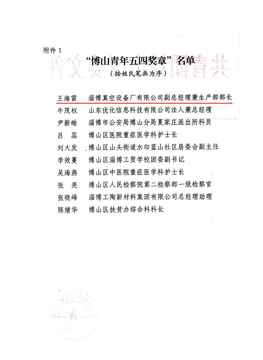 摘要:公司副總經(jīng)理王海雷同志榮獲“博山區(qū)青年五四獎(jiǎng)?wù)隆狈Q號(hào)