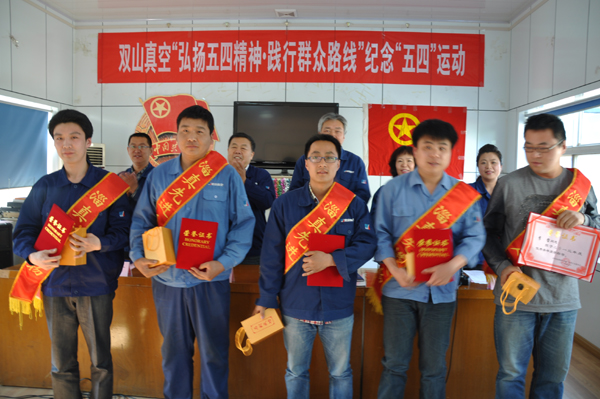 2014年5月4日,公司召開:雙山真空“弘揚五四精神-踐行群眾路線”紀念“五四”運動的會議,并向公司選進青年人才頒發(fā)證書及獎品。