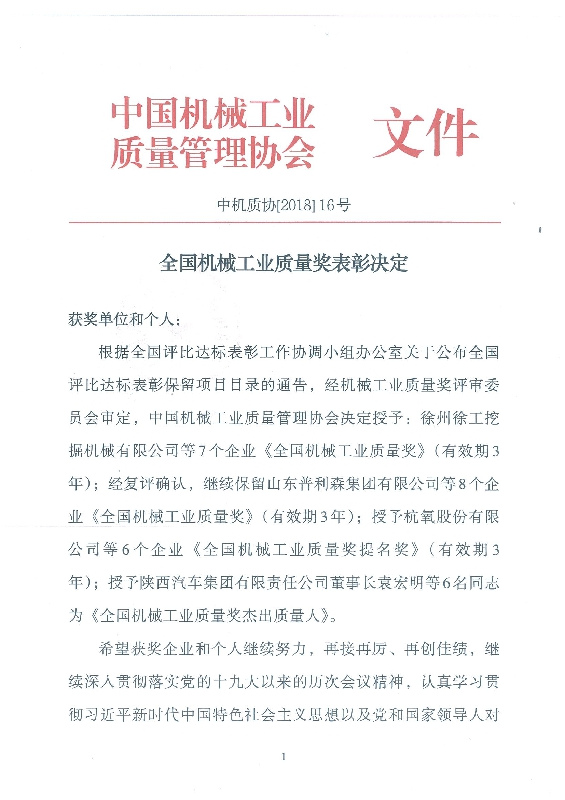 2018年12月19日至20日,中國機(jī)械工業(yè)質(zhì)量管理協(xié)會(huì)七屆五次理事擴(kuò)大會(huì)議在徐州舉行。會(huì)議對(duì)在機(jī)械工業(yè)質(zhì)量管理中作出優(yōu)異成績的先進(jìn)企業(yè)和優(yōu)秀個(gè)人進(jìn)行了表彰,公司董事長黃毅同志被授予“全國機(jī)械工業(yè)質(zhì)量獎(jiǎng)杰出質(zhì)量人”榮譽(yù)稱號(hào)。